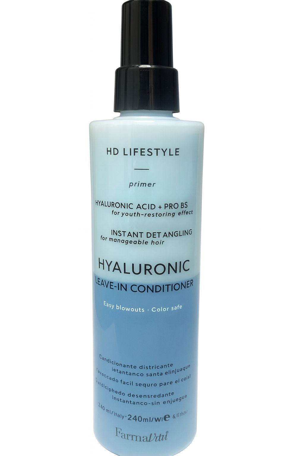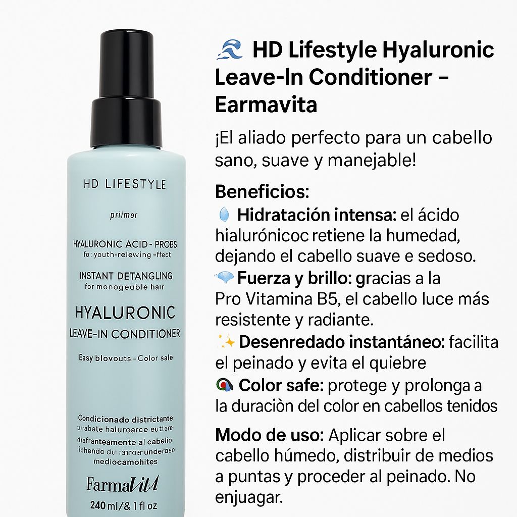 El HD Lifestyle Hyaluronic Leave-In Conditioner de Farmavita es un spray acondicionador sin enjuague, formulado para suavizar, desenredar y revitalizar el cabello de forma inmediata.