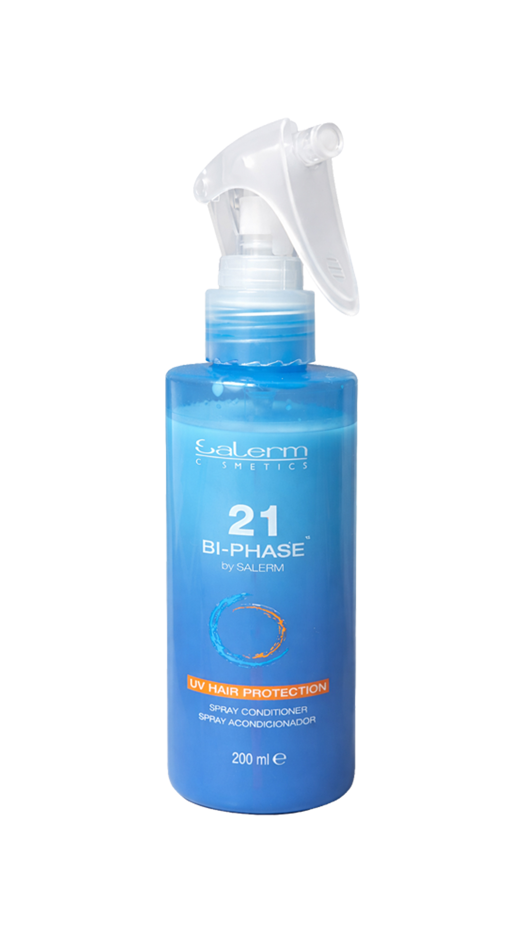 El Salerm 21 Bi-Phase UV Hair Protection es un acondicionador spray bifásico sin enjuague, diseñado para hidratar, proteger y desenredar el cabello, además de brindar protección contra rayos UV y factores ambientales.