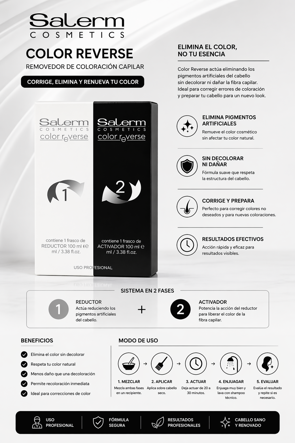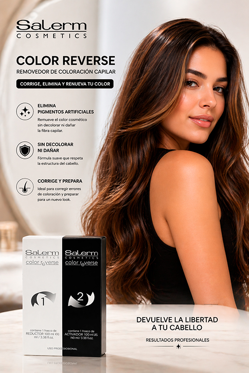 El Salerm Color Reverse es un sistema profesional removedor de color artificial, diseñado para eliminar pigmentos de tintes oxidativos del cabello sin decolorar ni alterar el color natural del cabello.